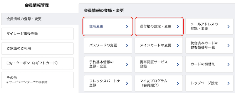ANAウェブサイトにログインし、マイメニュー ⇒「住所変更(住所など変更)」「送付物の設定・変更」のどちらかをクリッックします。