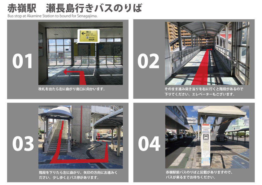 赤嶺駅から乗車する方は、赤嶺駅の南口を降りてすぐのところに瀬長島行バスのりば(「赤嶺駅前バスのりば」)があります。